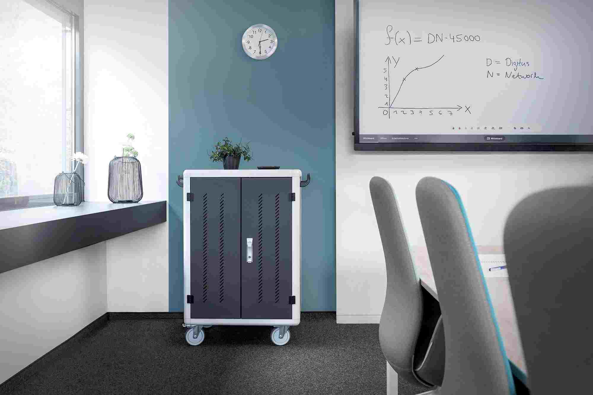 Mobilní nabíjecí skříňka od digitus® je ideálním a kompaktním řešením pro ukládání a nabíjení přenosných zařízení, jako jsou notebooky a tablety.B. Mobilní nabíjecí skříňky se často používají ve veřejných zařízeních.B školy k bezpečnému uložení zařízení na centrálním místě a k jejich nabíjení současně. Skříň obsahuje 3 řady po 10 nabíjecích stanicích, z nichž každá má na přední straně vlastní USB port. Kromě toho mohou být zařízení připojena k vestavěným zásuvkovým lištám (3 x 10násobný ochranný kontakt) na zadní straně. Díky velkorysým napájecím kabelovým posuvům a extra dlouhým regálům je zaručena optimální správa kabelů. Vestavěné ventilátory (3 x 24 V) ve spojení s větracími otvory zajišťují aktivní tepelnou diszi skříně.