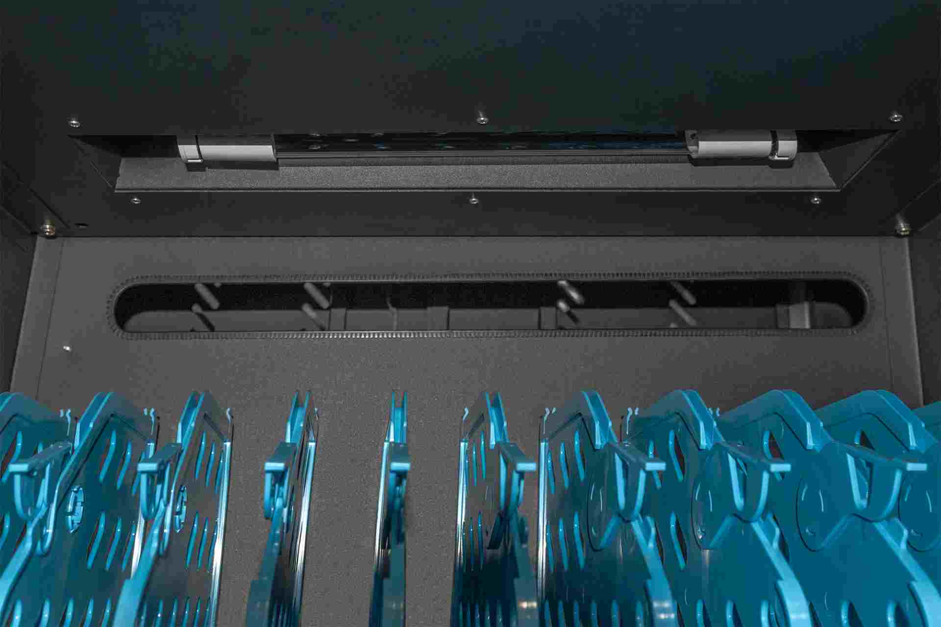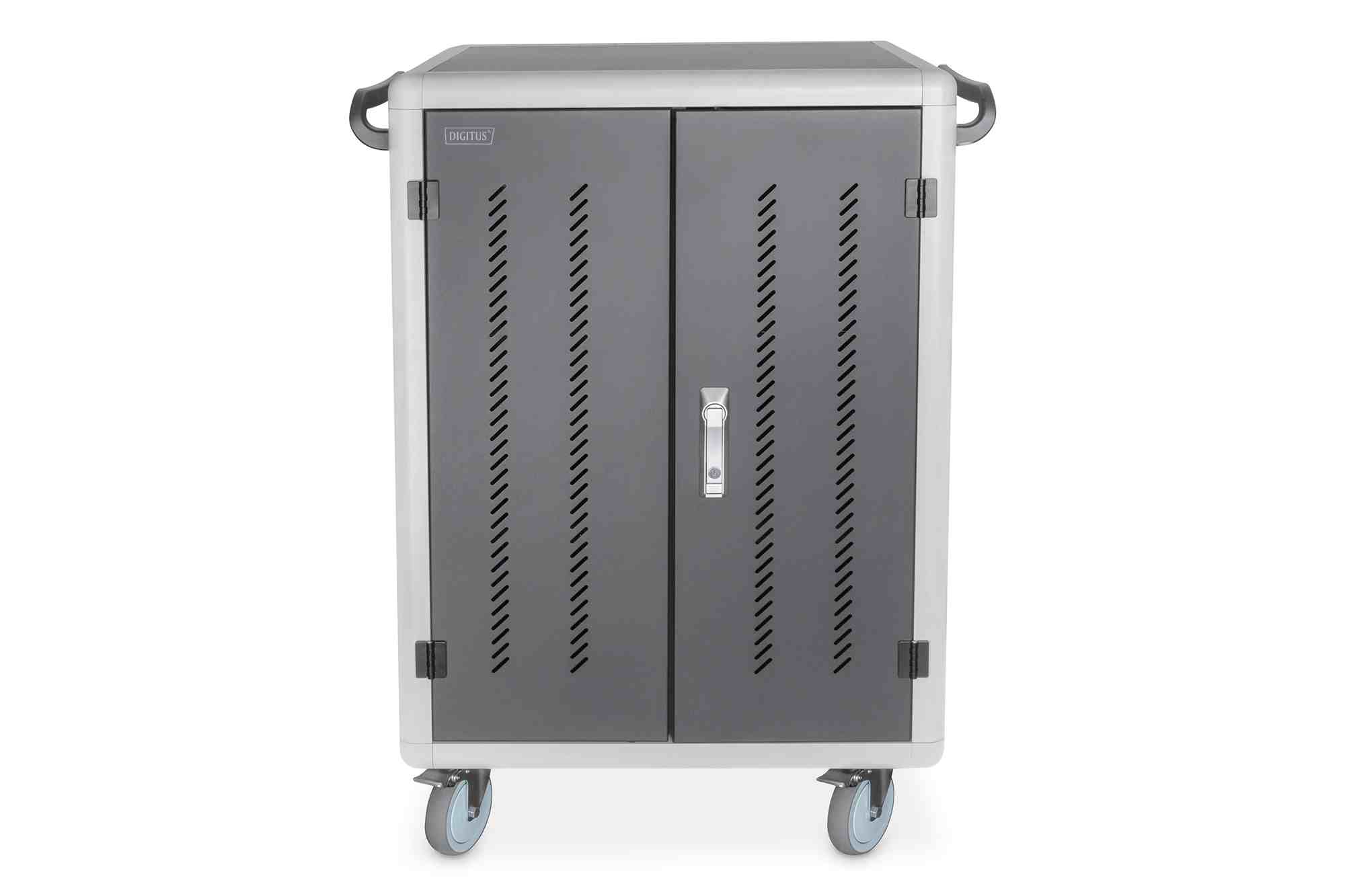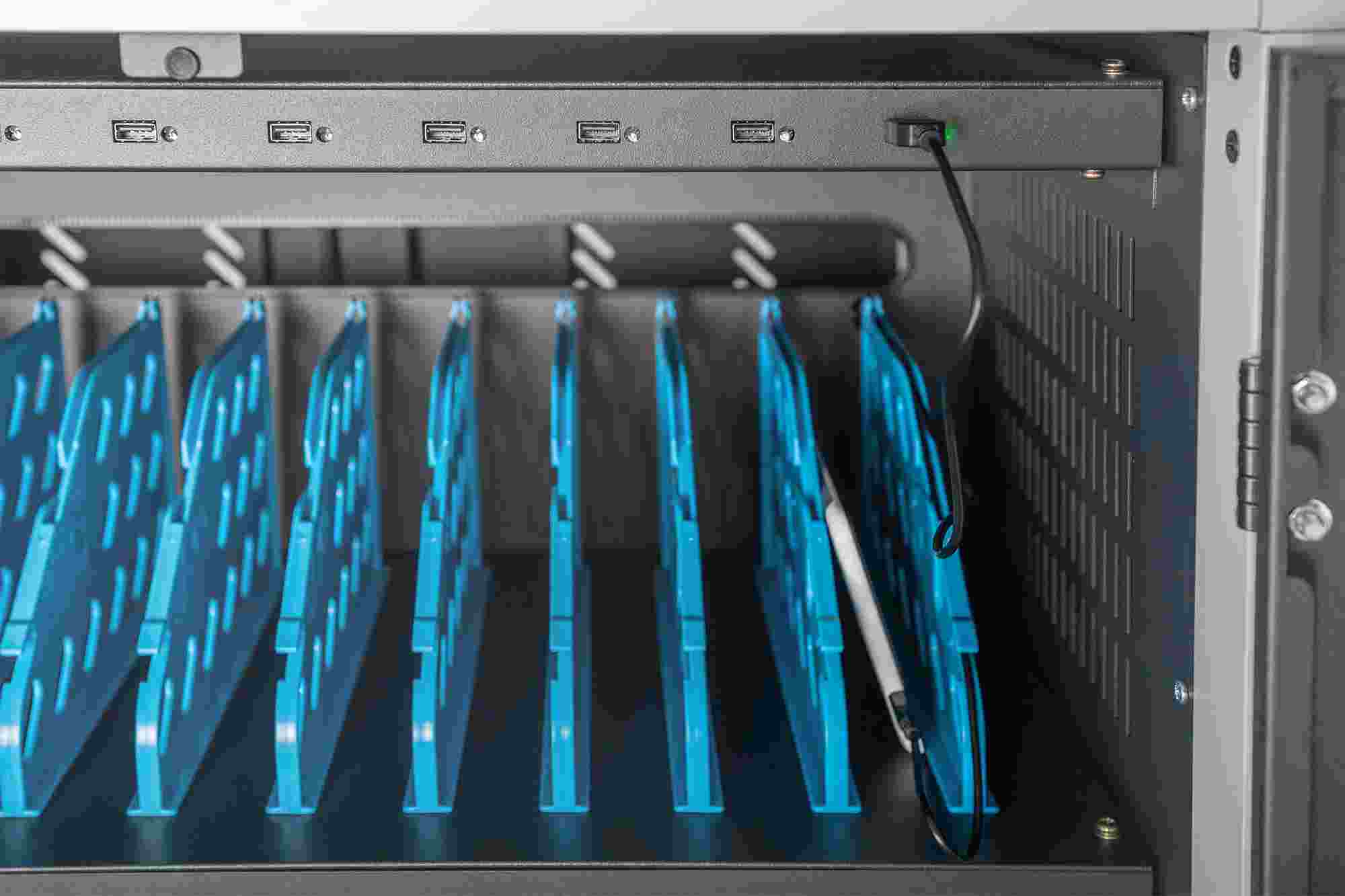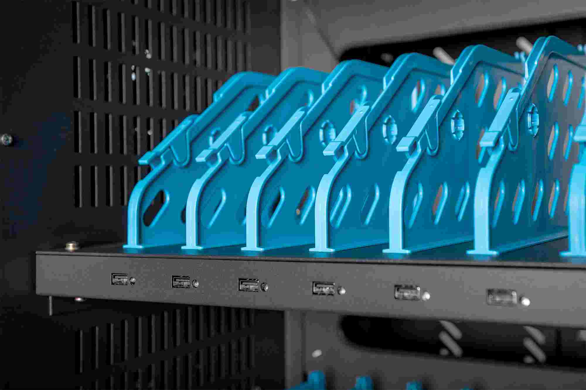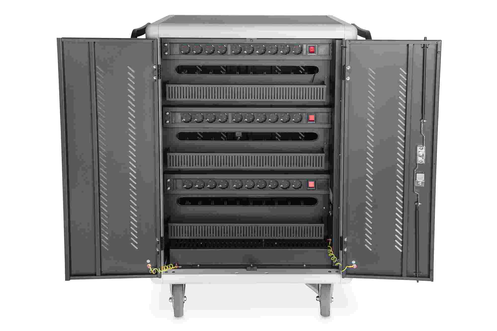 Mobilní nabíjecí skříň od společnosti DIGITUS® je ideálním a kompaktním řešením pro ukládání a nabíjení přenosných zařízení, jako jsou notebooky a tablety. Mobilní nabíjecí skříňky se často používají ve veřejných zařízeních, jako jsou školy, aby bylo možné zařízení bezpečně uložit na centrálním místě a zároveň je nabíjet. Skříňka obsahuje 3 řady po 10 nabíjecích stanicích, které mají na přední straně vlastní připojení USB. Zařízení lze připojit také pomocí instalovaných zásuvkových lišt (3 x 10 bezpečnostních zásuvek) v zadní části. Díky dostatečnému množství kabelových průchodek a úložnému prostoru pro přebytečné kabely je zaručena optimální správa kabelů. Instalované ventilátory (3 x 24 V) v kombinaci s větracími štěrbinami zajišťují aktivní chlazení skříně. Instalované UV-C lampy zajišťují sterilní podmínky, a tím i šetrnost k životnímu prostředí a zvýšenou hygienu. Pro centralizovanou synchronizaci dat lze k externímu portu USB připojit zařízení.