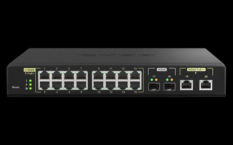 QNAP QSW-M2116P-2T2S je řízený switch L2 PoE se šestnácti 30W porty 2,5GbE PoE+, dvěma 90W 10GbE porty PoE++. Zařízení QSW-M2116P-2T2S, které nabízí celkovou energetickou hodnotu 280 W a dva porty 10GbE SFP+, umožňuje nejen vysokorychlostní a vysoce výko
