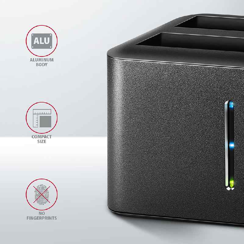 Dokovací stanici také využijete pro snadné klonování obsahu připojených disků bez potřeby připojení k PC. Do prvního slotu stanice HDD A (source) zasunete zdrojový disk a do druhého slotu HDD B (target) zasunete cílový. Pak jen zmáčknete klonovací tlačítko a sledujete průběh klonování na stupnici čtyř LED diod. Po zkopírování všech dat je na cílovém disku přesná kopie původního disku. Dock tak lze využít jako autonomní zařízení pro pohodlné duplikování a vytváření obrazů disků. Jedná se o nejjednodušší způsob, jak přenést obsah například starého HDD disku na nový SSD disk, a to včetně funkčního operačního systému (Windows, macOS, Linux …).