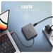 USB-C konektor je vyhrazen pouze pro napájení a současné dobíjení notebooků pomocí technologie Power Delivery 3.0 výkonem až 100W. Do hubu zapojíte USB-C Power Delivery nabíječku a hub připojíte k notebooku. Tím také uvolníte jeden USB-C port. Podmínkou je notebook s podporou nabíjení z USB-C portu pomocí Power Delivery a vhodná PD nabíječka.
