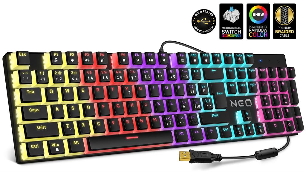 Profesionální mechanická klávesnice z řady NEO series pro hráče počítačových her v českém layoutu s celkem 12 módy barevného rainbow podsvícení a čtyřstupňovou regulací intenzity podsvícení. K dispozici je 12 multimediálních kláves.