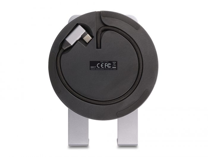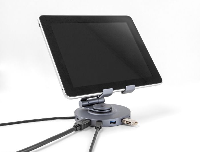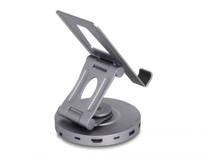 Tento dokovací stojan pro tablety a laptopy s držákem značky Delock je přesvědčivý nejen svým vzhledem, ale i stabilitou a funkcemi, jako například otočnému držáku v úhlu 360°. Gumové podložky připevněné na spodní straně a v držáku zajišťují, aby ani zařízení, ani držák neklouzali.