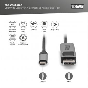 Obousměrný kabel adaptéru DIGITUS® USB Type C <=> DisplayPort podporuje přenos ze zdroje USB typu C do rozhraní DisplayPort. Stejně tak podporuje přenos ze zdroje DisplayPort do rozhraní USB typu C. Můžete například připojit notebook (vybavený rozhraním USB Type-C) k monitoru, televizoru nebo projektoru (rozhraní DisplayPort) nebo můžete připojit počítač (výstup DisplayPort) k monitoru (rozhraní USB Type-C). Napájení je napájeno přes USB port, takže není potřeba žádný externí zdroj napájení.