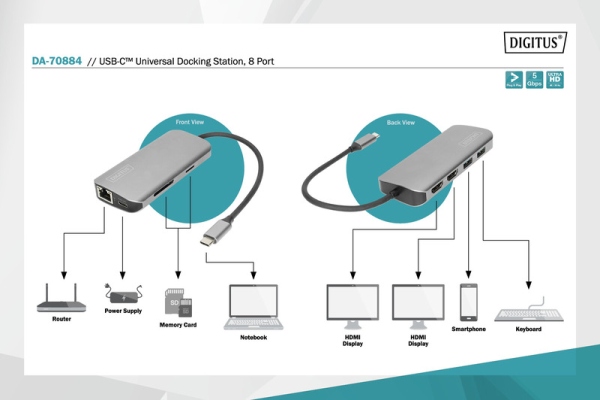 8portová dokovací stanice USB-C, 2xUSB3.0, 1xRJ45, 2xHDMI, 1xPD, 1xMicro SD, 1xSD, šedá Rozšiřte svůj notebook o 8 dalších rozhraní, jako je 4K HDMI®, Gigabit Ethernet nebo USB 3.0 - s napájením USB-C ™ 8 dalších rozhraní pro váš notebook / PC pro v