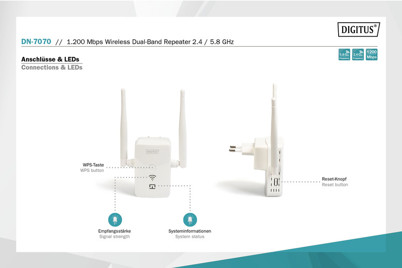 Description 1200 Mbps Wireless Repeater 2.4/5.8 GHz, WPS Extend your WiFi network by this wireless dual band repeater via WPS push button. Extend your WiFi network individually 2 external omni-directional WiFi antennas provide first class signals to y