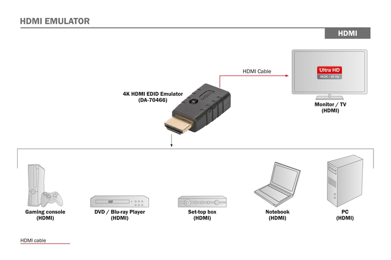 Emulátor Digitus 4K HDMI EDID nepřetržitě emuluje připojený monitor HDMI, takže zdroj signálu se nezmění ani neodpojí, i když je připojení přerušeno. Má přednastavená data EDID (rozlišení / časování), která najdete v uživatelské příručce. Pokud data EDID jednotlivého monitoru/displeje chybí, lze je snadno a rychle číst a klonovat pomocí praktické funkce klonování. Emulátor podporuje rozlišení až UHD 4K2K/60 Hz. Emulátor nabízí ideální řešení pro aplikace s HDMI extendry, rozbočovači, přepínači nebo převodníky.