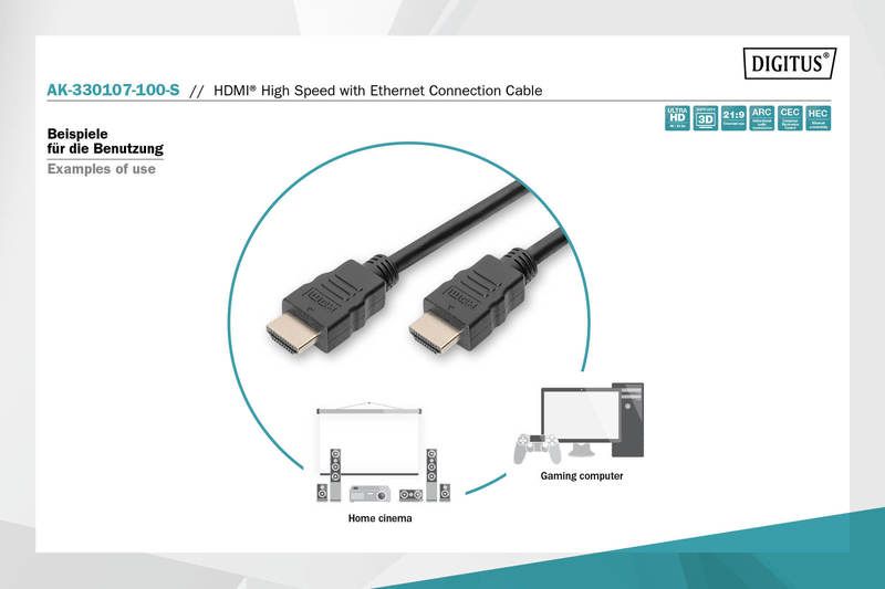 This Full HD (1080p) and 3D suitable cable used for connection of audio/video devices, such as Blu-ray player, game pads or consoles, etc., for example, with a TV, monitor or computer. Also capable for use of any IP-based application.