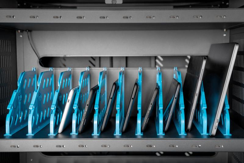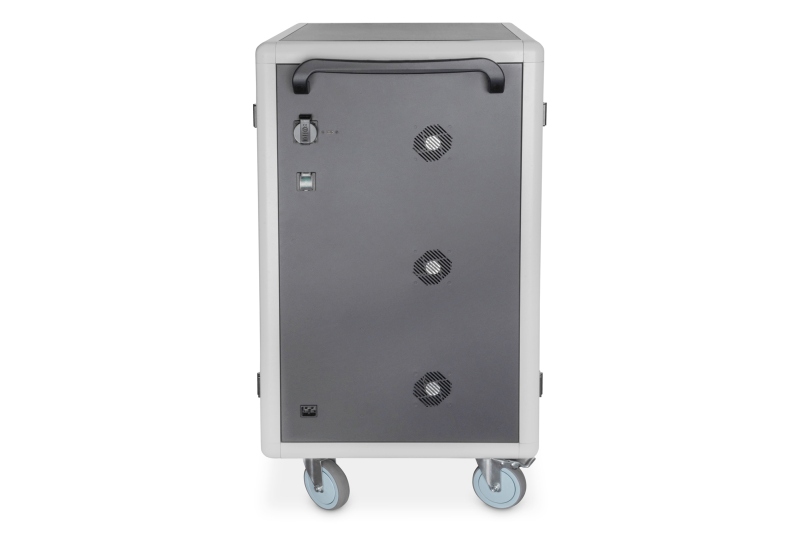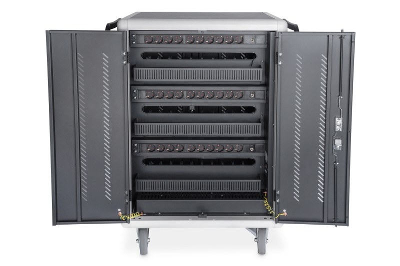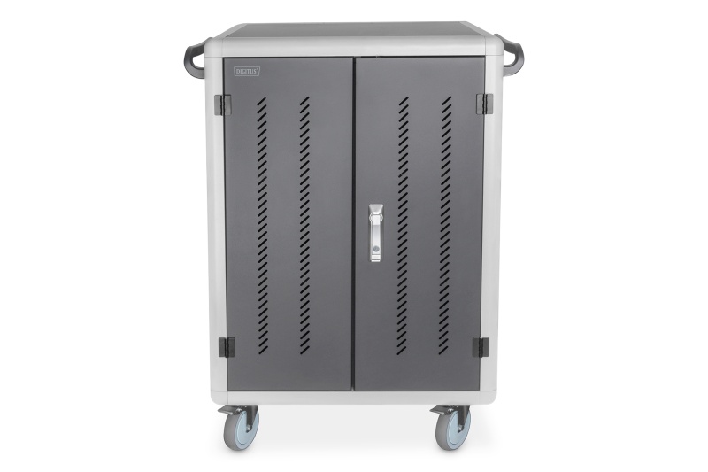 Mobilní nabíjecí skříň od DIGITUS® je ideálním a kompaktním řešením pro ukládání a nabíjení vašich přenosných zařízení, jako jsou notebooky a tablety. Mobilní nabíjecí skříně se často používají ve veřejných zařízeních, jako jsou školy, aby bylo možné bezpečně uložit zařízení na centrálním místě a zároveň je nabíjet. Skříň obsahuje 3 řady s 10 nabíjecími stanicemi, z nichž všechny mají na přední straně vlastní USB připojení. Zařízení lze také připojit pomocí instalovaných zásuvkových lišt (3 x 10 bezpečnostních zásuvek) vzadu. Díky velkým kabelovým průchodkám a nadměrnému uložení kabelů je zaručeno optimální vedení kabelů. Instalované ventilátory (3 x 24 V) kombinované s ventilačními štěrbinami zajišťují aktivní chlazení skříně.
