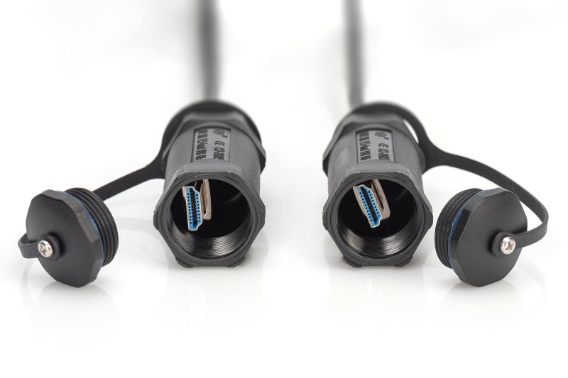 Připojovací kabel 4K HDMI AOC, ochranný kryt pro zástrčky IP 68; 30 m, 4K*2K@60HZ Díky konstrukci z oceli a aramidových vláken je kabel vysoce odolný a nabízí optimální ochranu proti vnějším vlivům. Pokud se kabel nepoužívá, jsou zástrčky chráněny pla