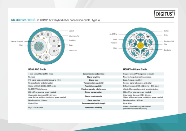 The active HDMI cable with AOC technology is based on a hybrid construction with copper and fiber optic cable, making bandwidths of up to 18 Gbit/s with full HDMI signal spectrum possible