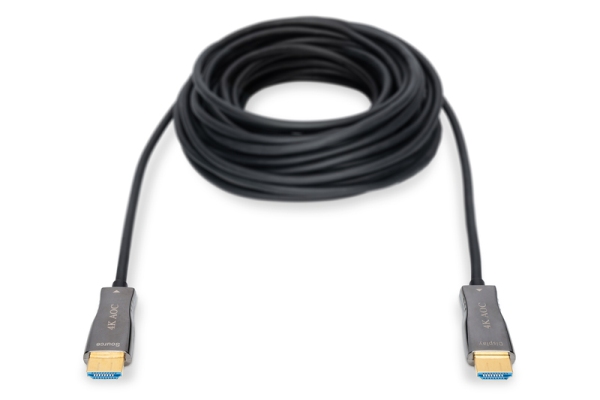 The active HDMI cable with AOC technology is based on a hybrid construction with copper and fiber optic cable, making bandwidths of up to 18 Gbit/s with full HDMI signal spectrum possible