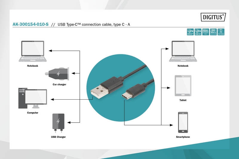 Description USB Type-C connection cable, type C to A M/M, 1.0m, 3A, 480MB, 2.0 Version, bl For superfast synchronising and charging For superfast synchronising and charging Supports up to 3A Power supply Support of USB PD (Power Delivery) specificati
