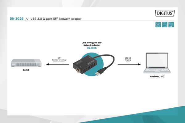Description USB3.0 Gigabit SFP Network Adapter additional SFP module needed Extend your laptop with USB 3.0 port to a complete Gigabit SFP network connection. Up to 1000 Mbps data transfer rate Easy to install thanks to plug and play - driver on v