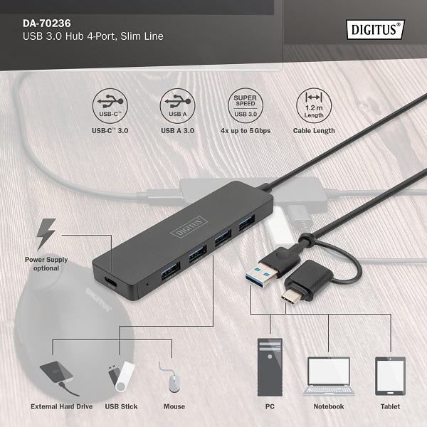 Rozbočovač DIGITUS USB 3.0 Hub Slim Line je ideálním rozšířením pro každé pracoviště. Až čtyři zařízení USB lze připojit a používat současně, což usnadňuje použití více vstupních zařízení nebo přenosných úložných zařízení. Díky technologii USB 3.0 dosahují datové přenosy rychlosti až 5 Gbps a zajišťují nejrychlejší výměnu dat. Díky tenkému designu je 4portový hub ideálním společníkem na cestách, ale je také nepostradatelný v domácnosti a kanceláři. Pomocí 1,2m kabelu můžete upravit délku tak, aby dokonale odpovídala vašemu notebooku nebo pracovní stanici.