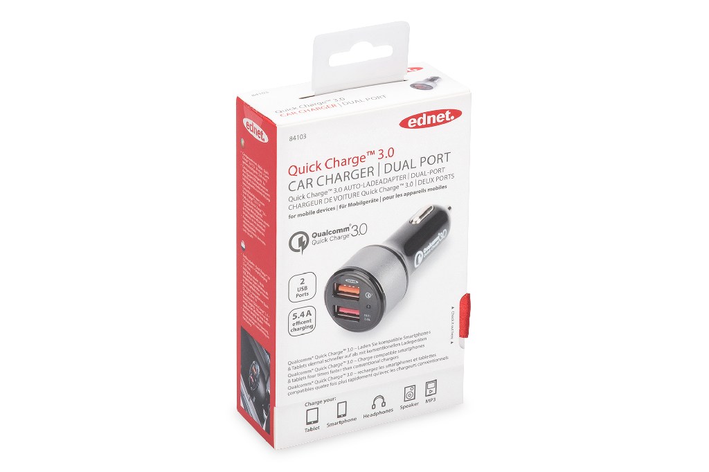 USB Car Charger, Quick Charge 3.0, 2 Ports Input 12-24V, Outputs: 3-6.5V/3A, 5V/2.4A Qualcomm Quick Charge 3.0 Thanks to Qualcomm® Quick Charge™ 3.0, charge your mobile devices four times faster than conventional chargers The ednet Quick Charge™ 3.0
