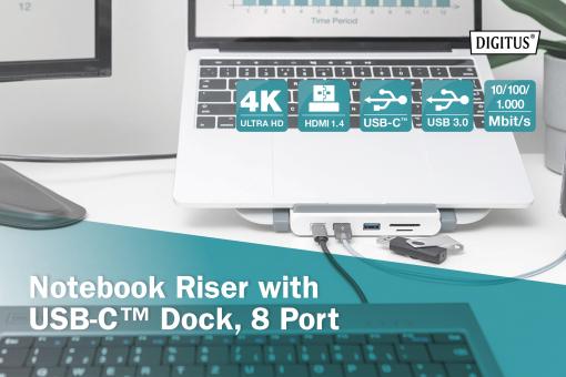 DIGITUS variabilní stojan na notebook s integrovanou dokovací stanicí USB-C ™, 8 portů