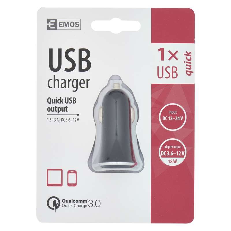 Emos napájecí zdroj USB CL QuickCharge3.0, 3A (18W), 1x USB, do auta