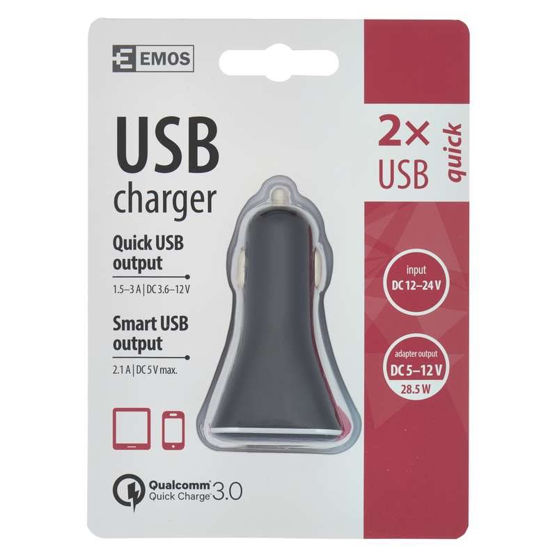 Emos napájecí zdroj USB CL QuickCharge3.0, 3A (28.5W), 2x USB, do auta