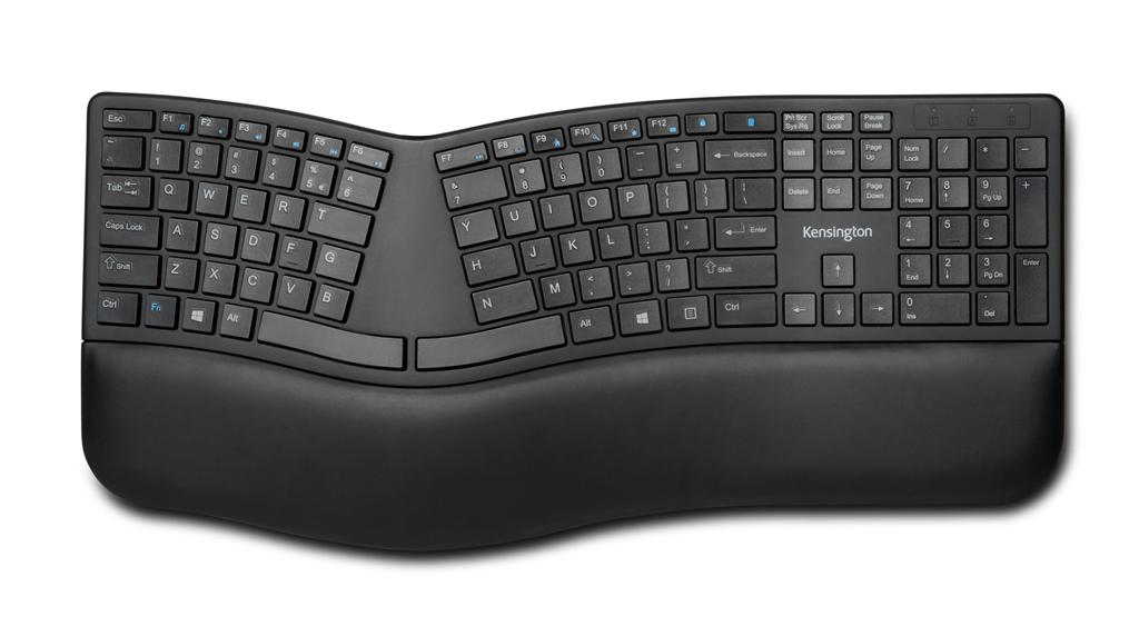 Bezdrátová klávesnice Kensington Pro Fit® Ergo s ergonomickým schválením a rozdělenou a nakloněnou klávesnicí s nastavitelným zpětným náklonem a vestavěnou opěrkou zápěstí umožňuje lepší polohu rukou. Mezi funkce patří duální bezdrátové připojení (2,4 GHz a Bluetooth 4.0 LE) se 128bitovým šifrováním AES, tiché psaní, klávesy odolné proti polití, klávesy F pro zkratky, zámek velkých písmen - CAPS LOCK, zámek číslic a zámek posouvání - NUM LOCK, přepínač úspory energie se třemi režimy a vyměnitelný přijímač*. * V případě ztráty nebo poškození přijímače stačí zakoupit nový, spárovat jej s myší a je připraven.