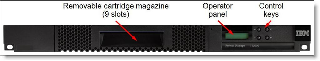 With a capacity of nine cartridges, the TS2900 Tape Autoloader is a rack-mountable or deskside unit that contains a single IBM LTO Ultrium half-high SAS tape drive. The choice of the tape drives includes IBM LTO Ultrium 8 Half-High SAS Tape Drive (Model S8H), IBM LTO Ultrium 7 Half-High SAS Tape Drive (Model S7H), IBM LTO Ultrium 6 Half-High SAS Tape Drive (Model S6H), or IBM LTO Ultrium 5 Half-High SAS Tape Drive (Model S5H).