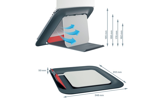 Stojan pod notebook Leitz Cosy Ergo zvedne monitor vašeho notebooku, zvýší tak pohodlí jeho sledování a pomůže zlepšit držení těla. Stojan zvedne notebook a usnadní cirkulaci vzduchu pro chlazení notebooku, přispívá se zvýšení výkonnosti akumulátoru.