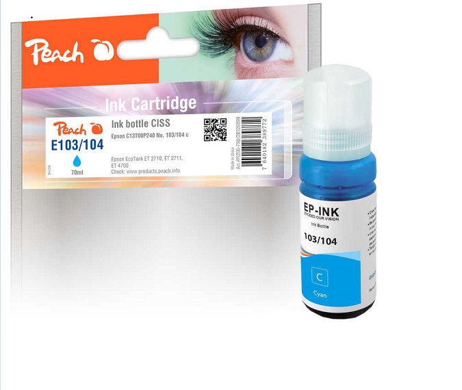 Technical Data Brand Peach SKU 320899 (PI200-798) EAN 7640182389772 Manufacturer ID Epson No. 103 c, No. 104 c, C13T00S240, C13T00P240 Obsah 70 ml Color Yield S Kompatibilní tiskárny (15) Epson EcoTank ET-2700 Epson EcoTank ET-2750 Epson Eco