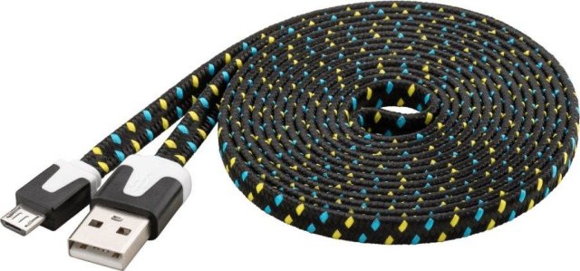 PremiumCord Kabel micro USB 2.0, A-B 2m, plochý textilní kabel, černo-modro-žlutý - USB 2.0 rychlost až 480Mbps - USB kabel umožňuje dobíjení telefonu po jeho připojení k počítači přímo přímo z USB portu počítače - kabel určen pro připojení všech z