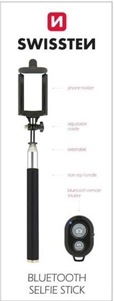 Teleskopická selfie tyč Swissten s bluetooth dálkovým ovladačem a silikonovým pouzdrem, které umožňuje připevnit ovladač přímo na tyč. Kompatibilní s iOS i Android. Délka vysunutí až 97 cm. Baleno v blistru Swissten.