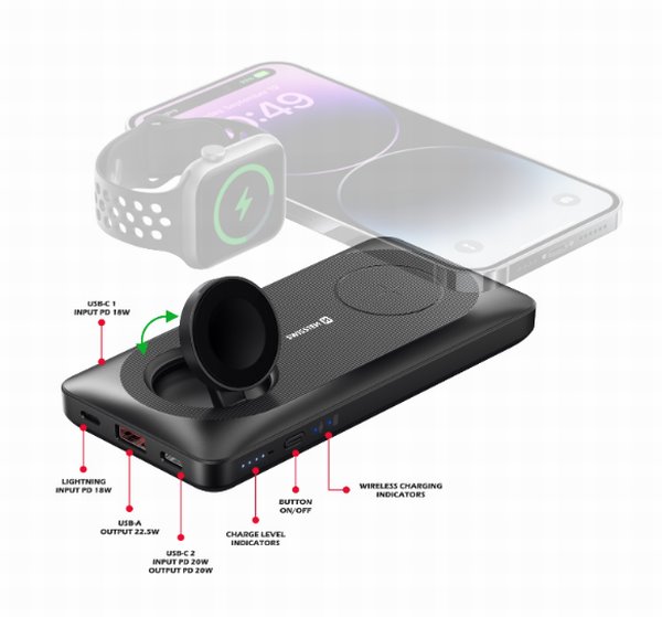 Powerbanka disponuje dvěma bezdrátovými výstupy. Jeden je určen pro chytré hodinky Apple Watch s výstupním výkonem 2,5W a druhý pro smartphony s výstupním výkonem až 15W.