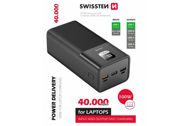 Elegantní powerbanka SWISSTEN s kapacitou 40.000mAh(148Wh) disponuje vysokým výstupním výkonem 100W, rychlým dobíjením a pro zvýšení bezpečnosti je vyrobena z nehořlavého materiálu. Baleno v krabičce SWISSTEN.