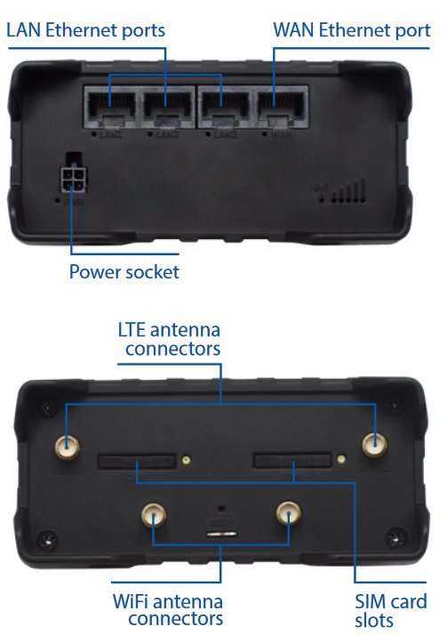 Rozhraní: 5 x gigabitový ethernetový port (1 x WAN (lze konfigurovat jako LAN), 4 x LAN), dvoupásmová Wi-Fi 802.11ac Wave-2 (až 150 klientských připojení), Bluetooth LE, USB, 2 x SIM sloty (Mini SIM - 2FF), 1 x digitální in / out, 4 x SMA pro LTE, 2 x RP-SMA pro WiFi, 1 x RP-SMA pro Bluetooth, 1 x SMA pro GNNS