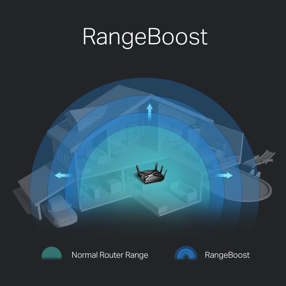 Vysoce výkonné antény s výkonným zesilovačem vytvářejí silný Wi-Fi signál v celé domácnosti. Technologie RangeBoost výrazně zlepšuje schopnost detekovat zařízení, která jsou dále od zdroje nebo s nízkým výkonem, což vaší síti poskytuje ještě větší pokrytí. Funkce Beamforming zaměřuje bezdrátové signály směrem k připojeným zařízením a zajišťuje stabilní Wi-Fi.