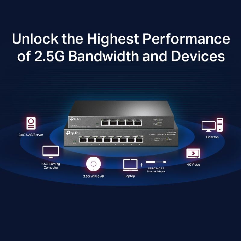 TL-SG108-M2 8-Port 2.5G Desktop Switch Eight 2.5 Gbps Ports. 8× 2.5-Gigabit ports unlock the highest performance of your Multi-Gig bandwidth and devices, and provide up to 40 Gbps of switching capacity. Super-Fast Connections. Provides super-fast conne