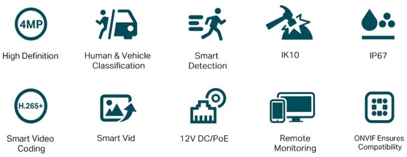 VIGI C240I(4mm) je základní 4 megapixelová Dome kamera značky TP-Link určená pro venkovní použití s fixním objektivem 4 mm, IR přísvitem do 30m vzdálenosti a ethernetovým portem s 802.3af PoE. Kamera má max. rozlišení 2560 × 1440 px (při 30 fps), pozorov