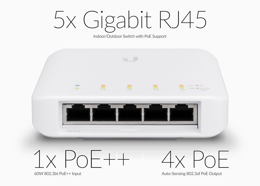 USW-FLEX je 5-portový venkovní Gigabitový switch s možností PoE-In a PoE-Out na 4 portech. Switch umožňuje na výstupních portech aktivní napájení typu 802.3af, což dává celkově 15.4W na každém portu. Univerzální montáž USW-Flex lze instalovat vodorovn